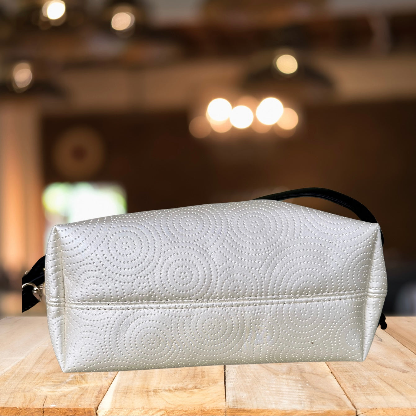 Indulge in the beauty of our Boho Bucket Bag! Crafted with off white faux leather, this bag features a unique embedded design and It is a midsized interior with multiple pockets for all your essentials. Elevate your style and add a touch of elegance to any outfit.