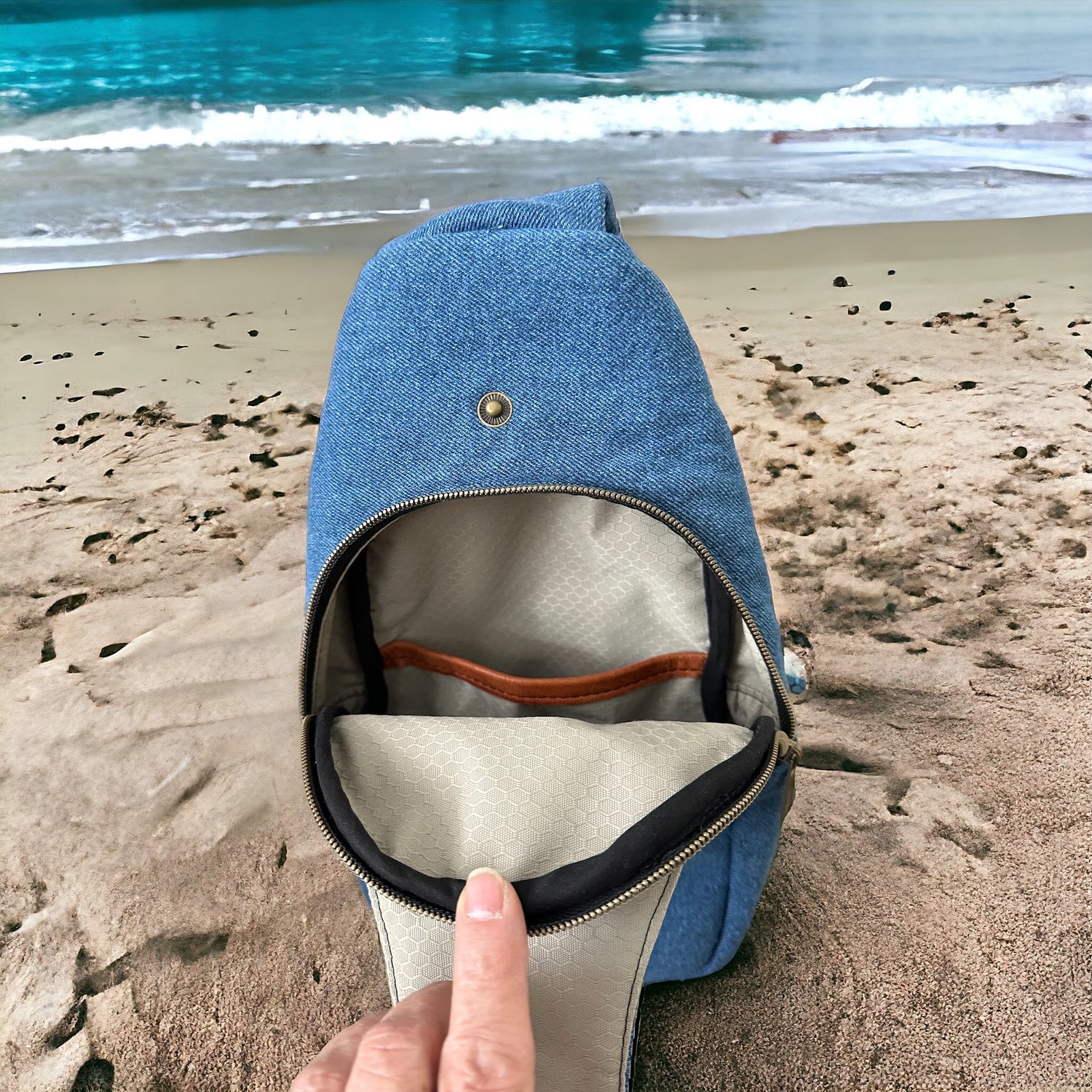 The thoughtful design of the Denim Sling Backpack prioritizes convenience without compromising on style. The spacious main compartment is perfect for carrying your essentials – whether it's your tablet, wallet, or a change of clothes. The adjustable webbing strap allows you to wear it comfortably across your body, providing easy access to your belongings while keeping your hands free.