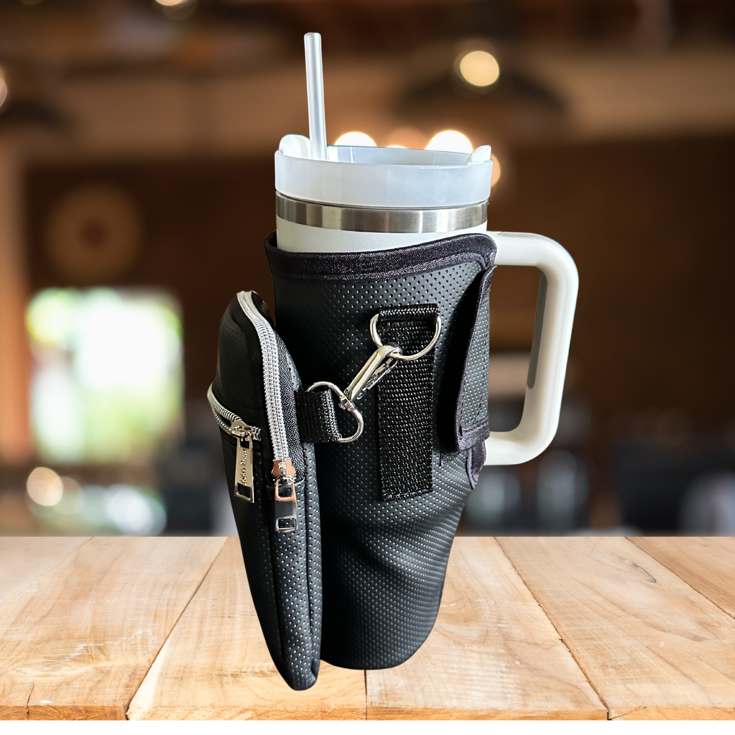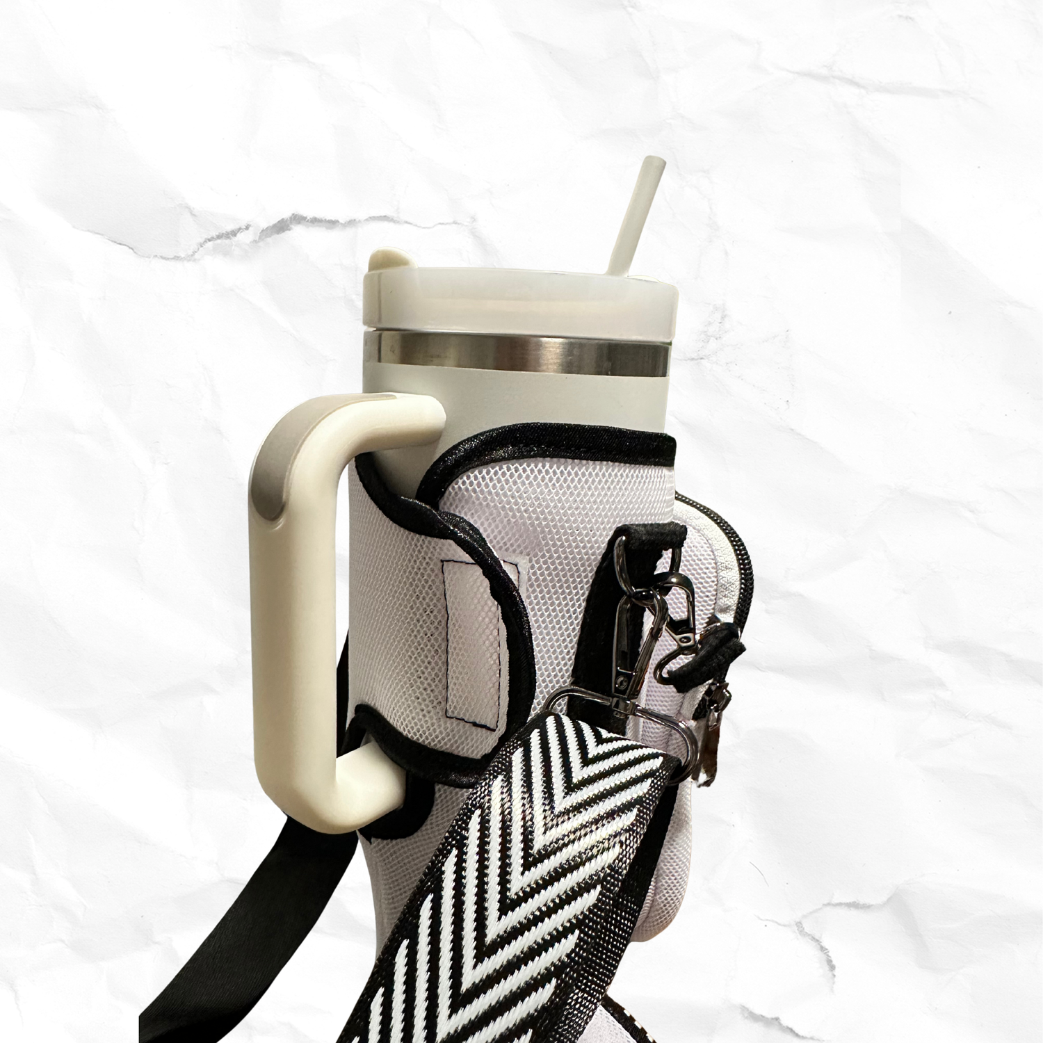 New! Water bottle holder for the 40oz cup that has a handle! Detachable front pouch that will hold most modern cellphones. The pouch has a small zippered pocket for cards. The white holder is made from Air Mesh for breathability.