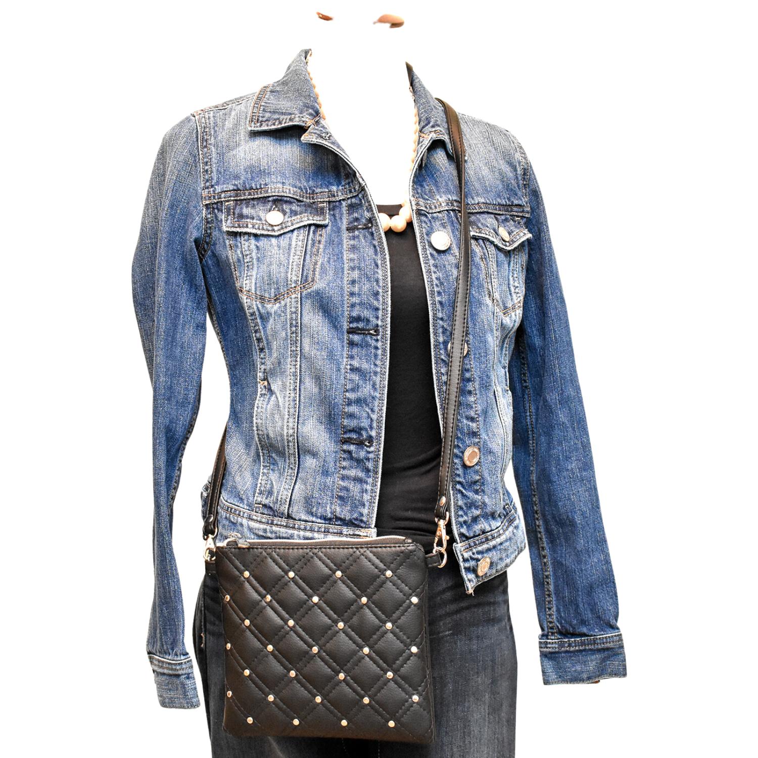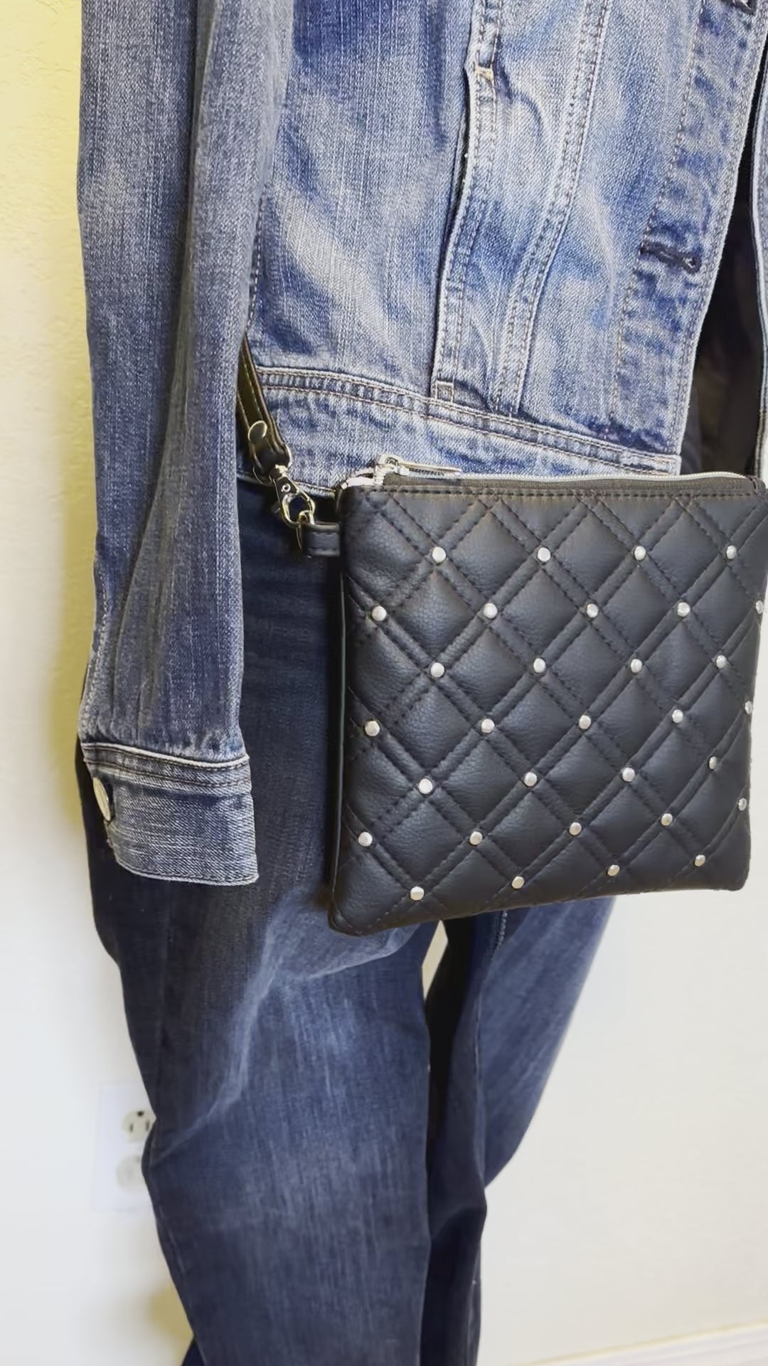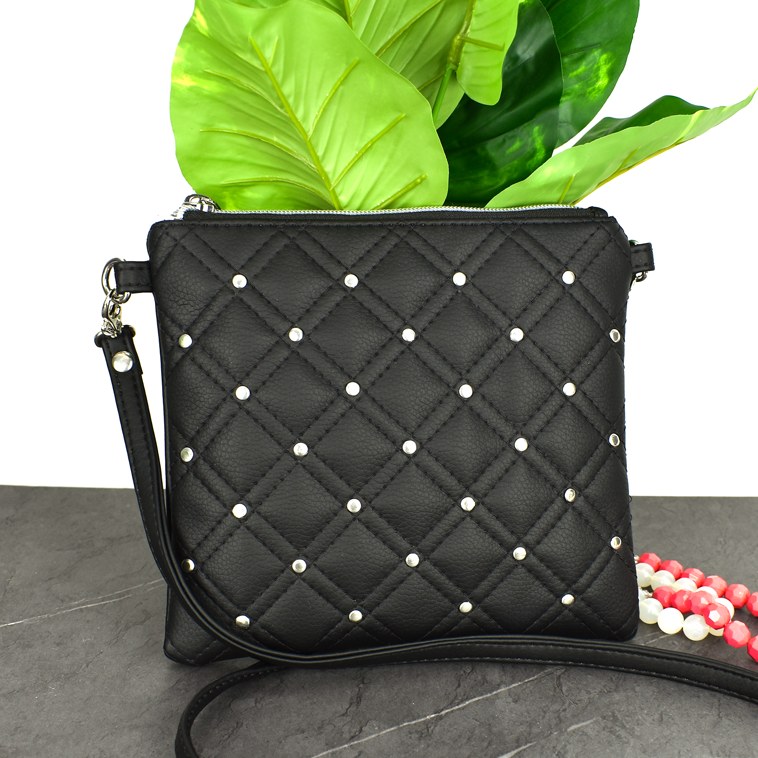 Whether you're running errands, going out for a night on the town, or just need a stylish way to carry your essentials, this Black Quilted Crossbody Purse with silver rivets and black and white striped lining (waterproof) is the perfect fit. With plenty of space for your phone, wallet, keys, and other small necessities, you'll have everything you need right at your fingertips. So why wait? Add a touch of class and style to your wardrobe with this fabulous bag today!