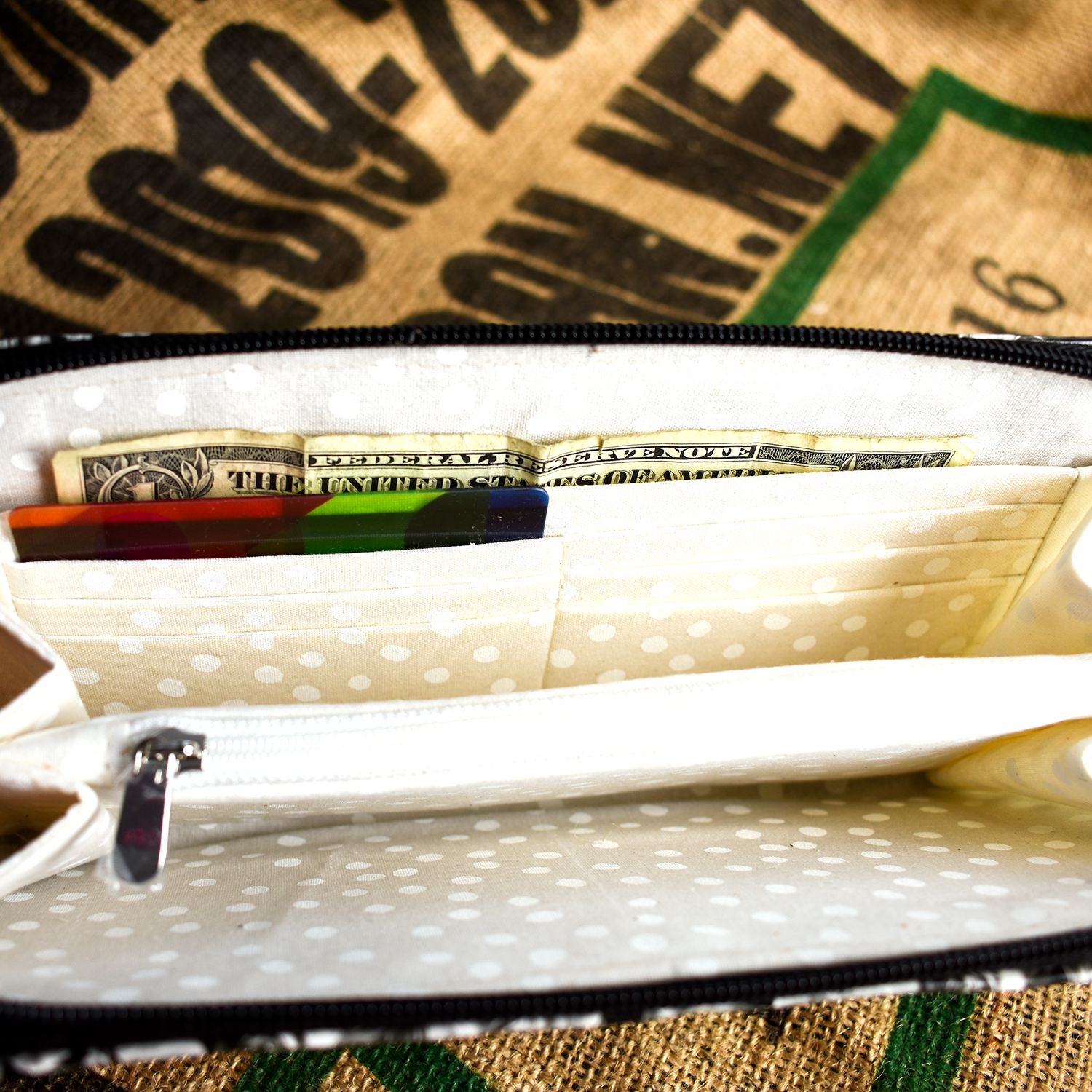 Classic styled zippered wallet. There is a center zippered coin pocket. On one side of the wallet there are card slots for you card. The other side could be used to hold a cellphone.