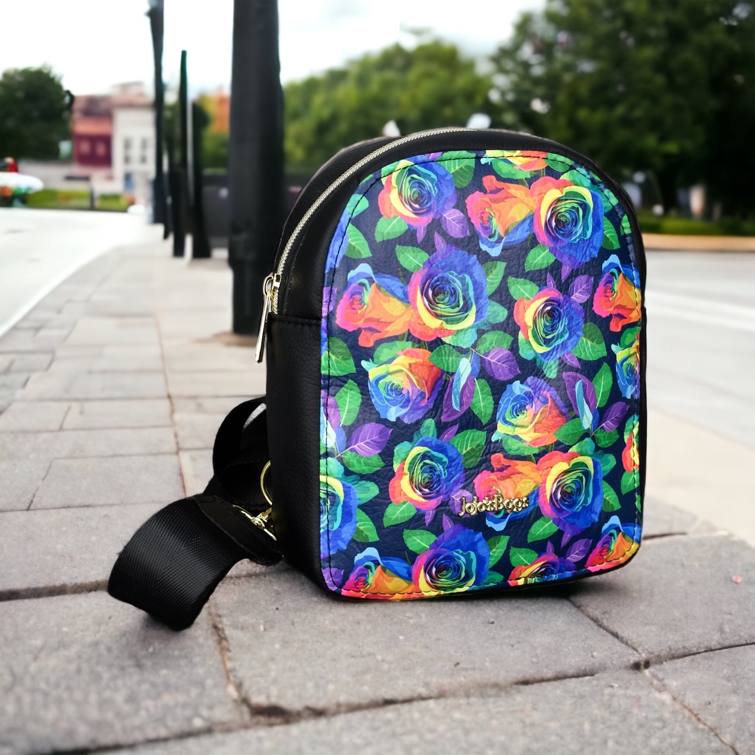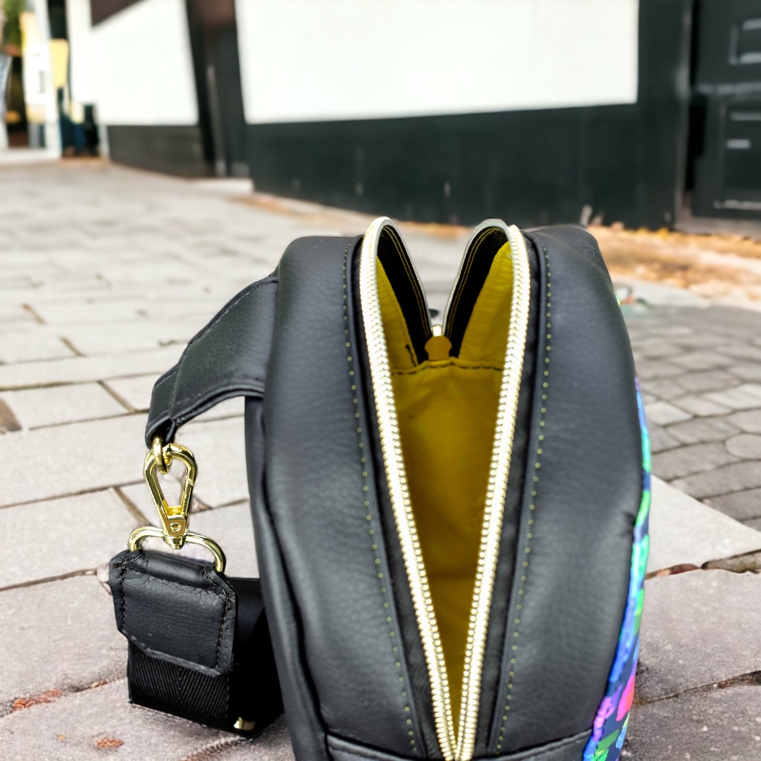 Introducing the perfect combination of fashion and function! Our mini designer-styled backpack is a true showstopper. Crafted from high-quality floral and black faux leather, it boasts a luxurious look and feel while being environmentally friendly. The stylish bright yellow and polka dot lining adds a trendy touch.