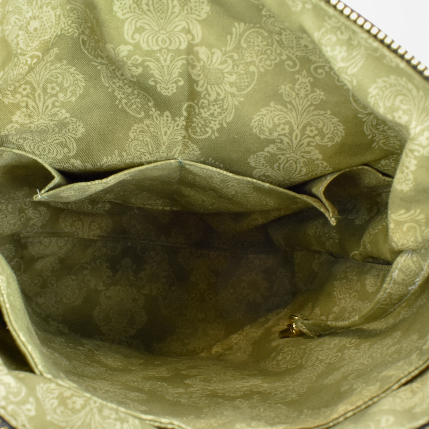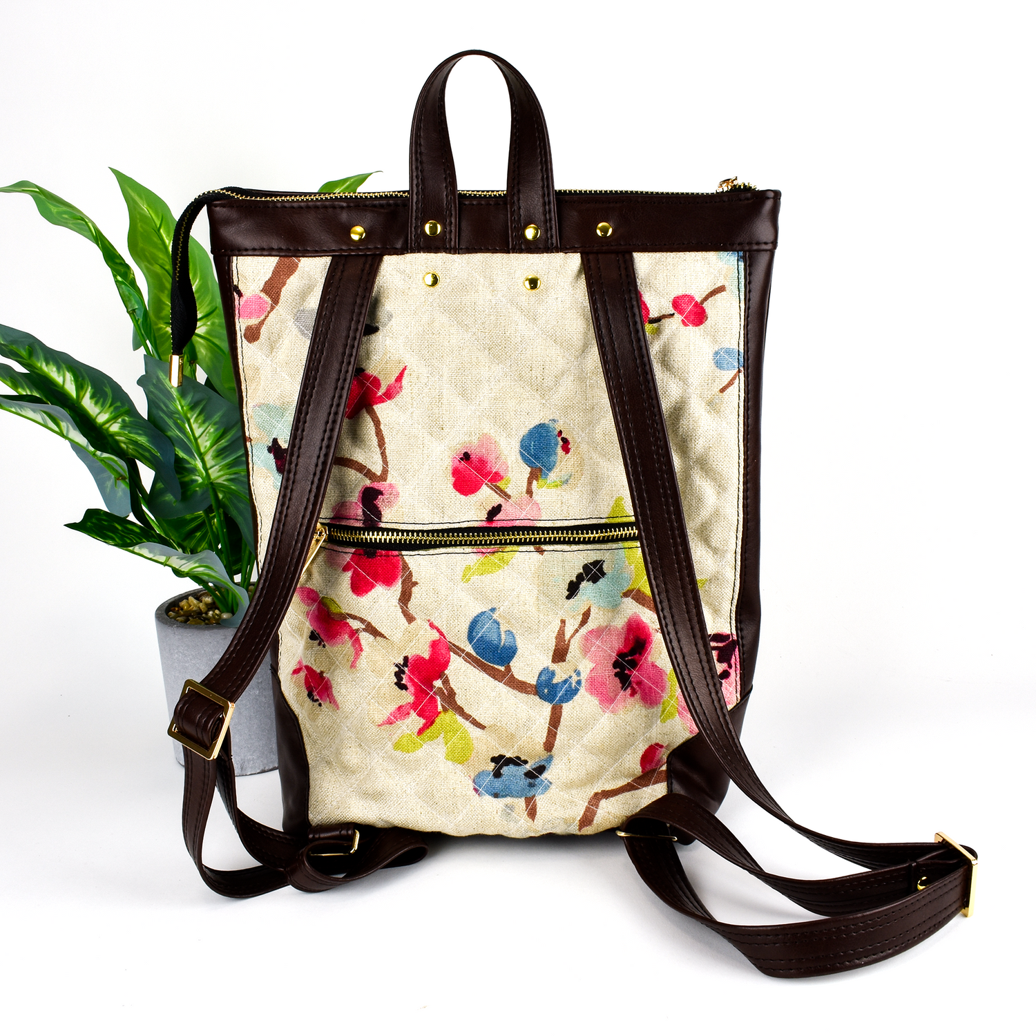 This unique bag has adjustable backpack straps plus a top carry handle. The top of the backpack has a top zipper closure and also has a front cell phone pocket. On the back there is a zipper pocket with built-in card slots. Inside there is an interior cushioned electronic device pocket plus interior pleated slip pocket. An added feature there is an interior key fob.