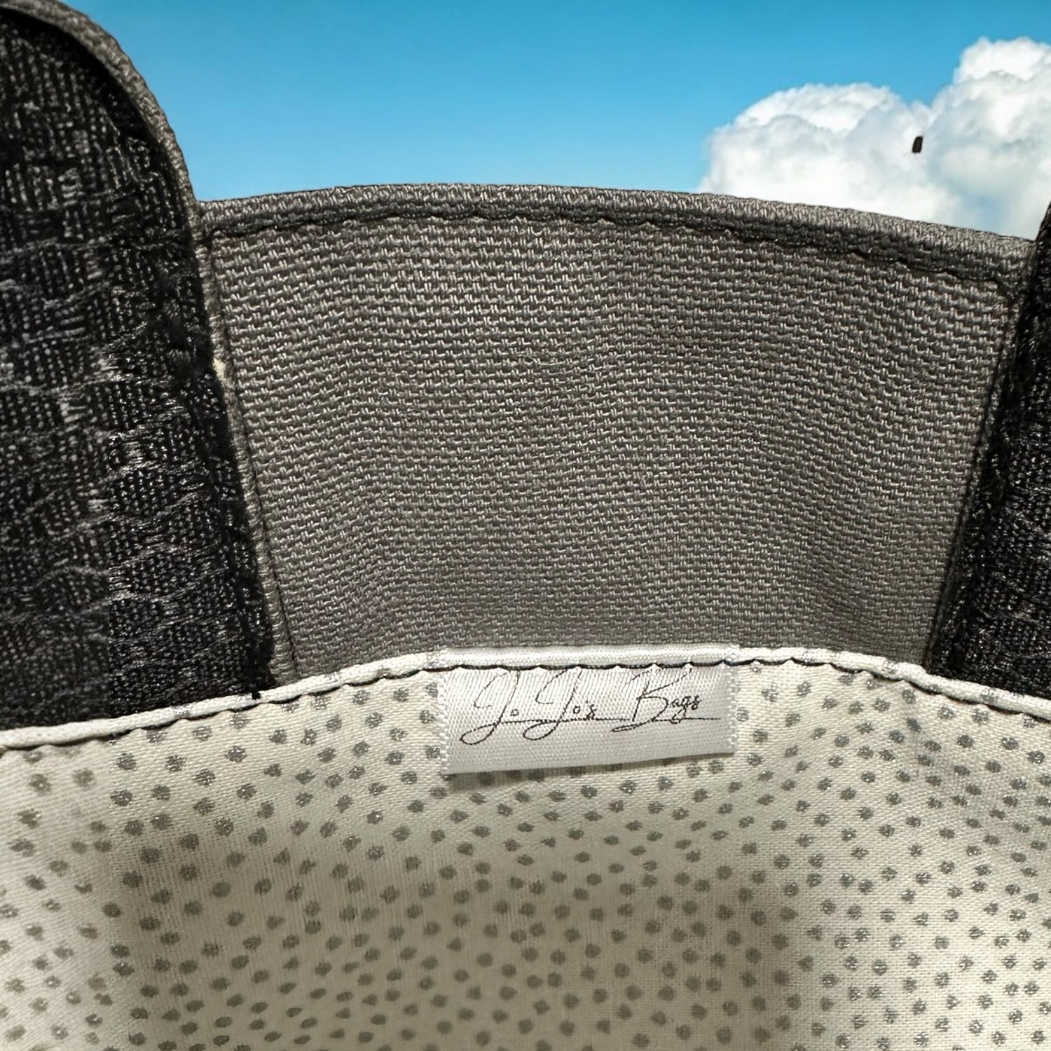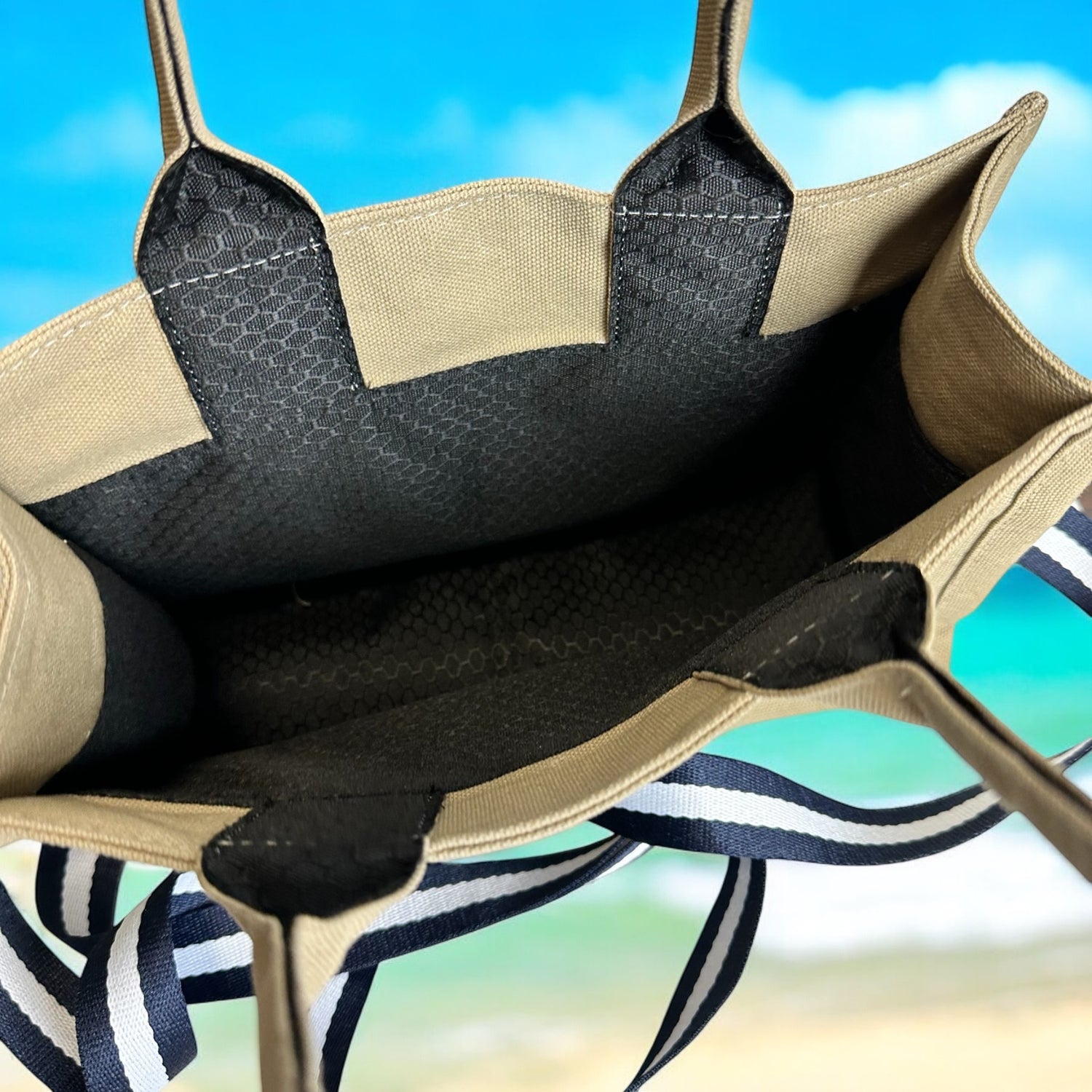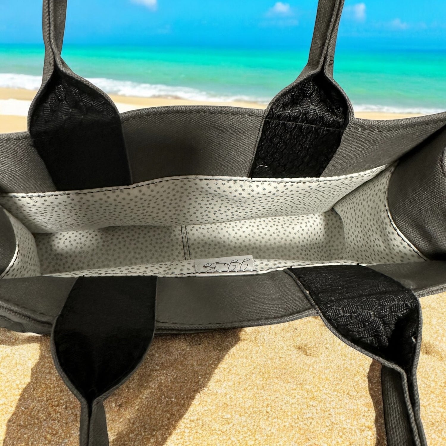just like the famous one but at a fraction of the cost. Each one is made with durable canvas fabric on the exterior the gray tote has a white and silver cotton fabric the tan tote has water resistant fabric Both have a small handle and a crossbody strap.