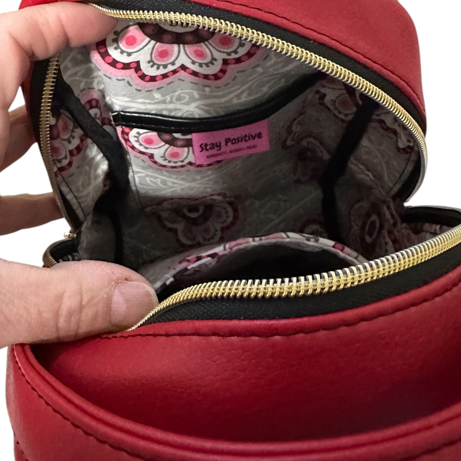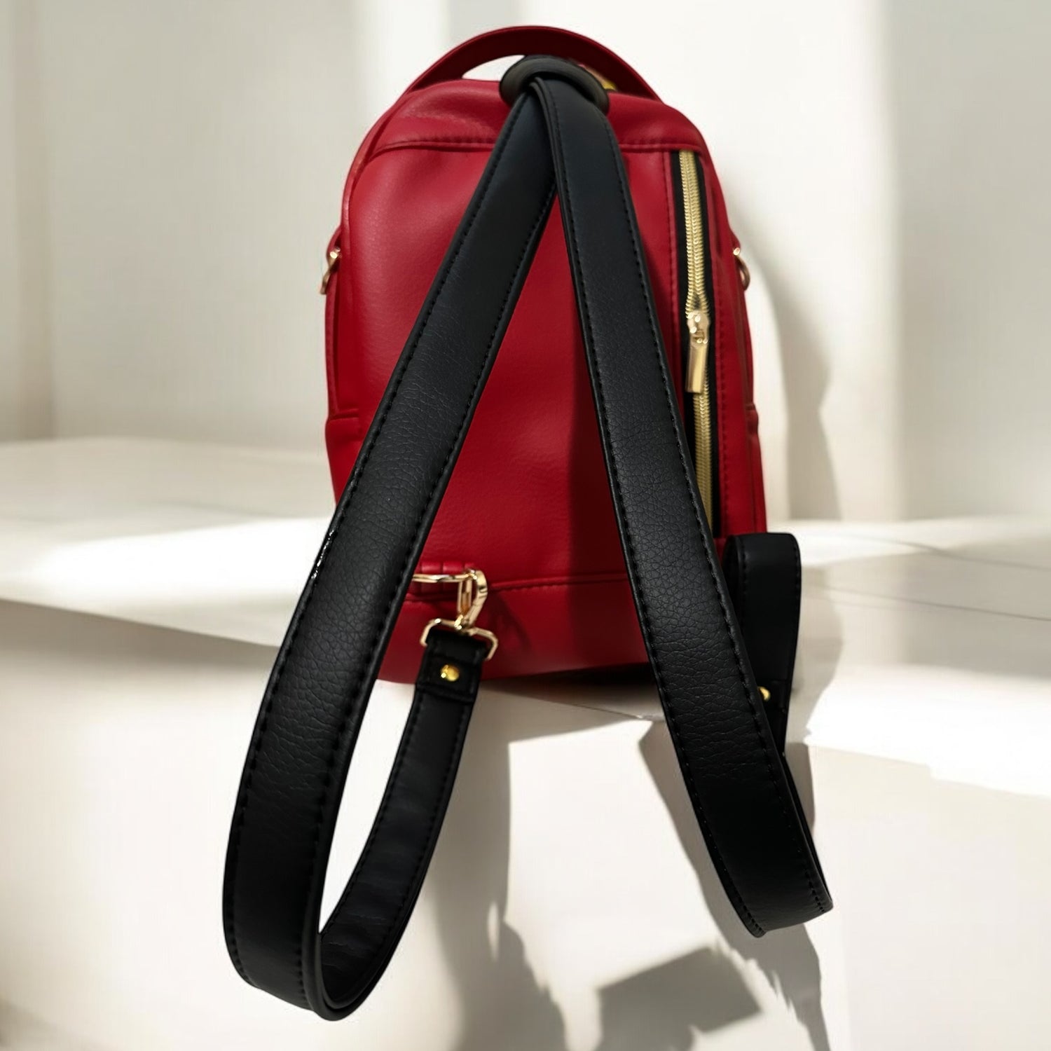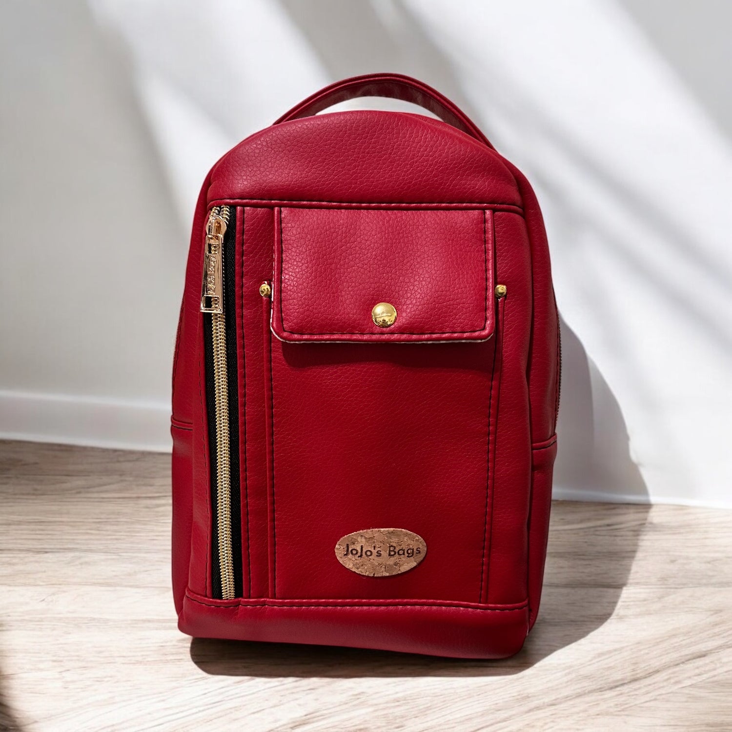 This backpack is the ultimate accessory for fashion-forward individuals. With its vibrant red color and stylish front pocket, it's perfect for carrying your essentials both inside and out. There is back zipped pocket also. On the inside you will find a padded pocket for a tablet and a small slip pocket.